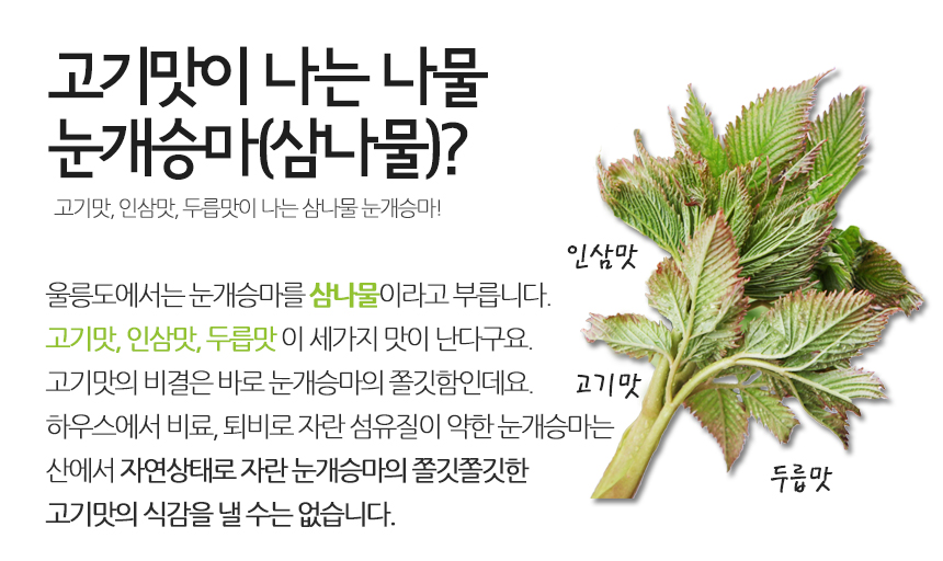 • 강원도 홍천 청정지역에서 자란 맛있는 눈개승마 / 해발 600m 고랭지에서 자라 연하고 부드러워요!