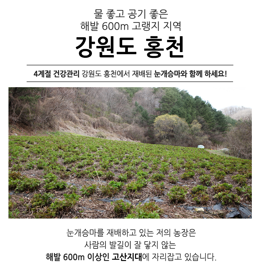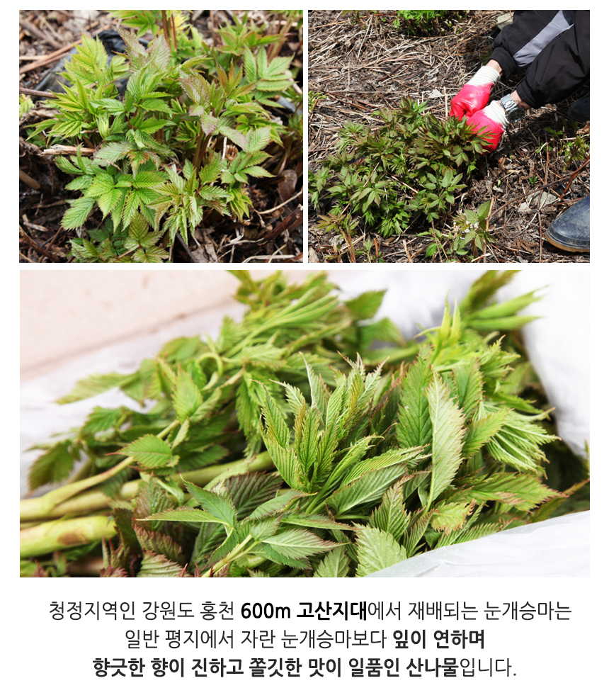 - 강원도 홍천 청정지역에서 자란 맛있는 눈개승마 / 해발 600m 고랭지에서 자라 연하고 부드러워요!