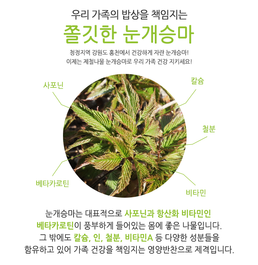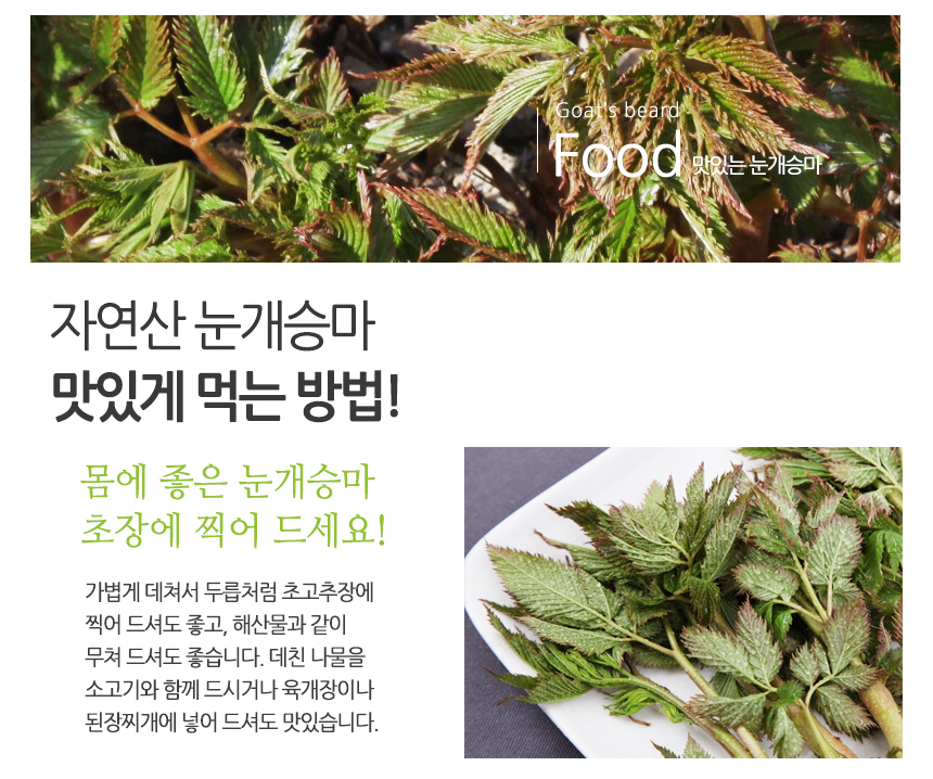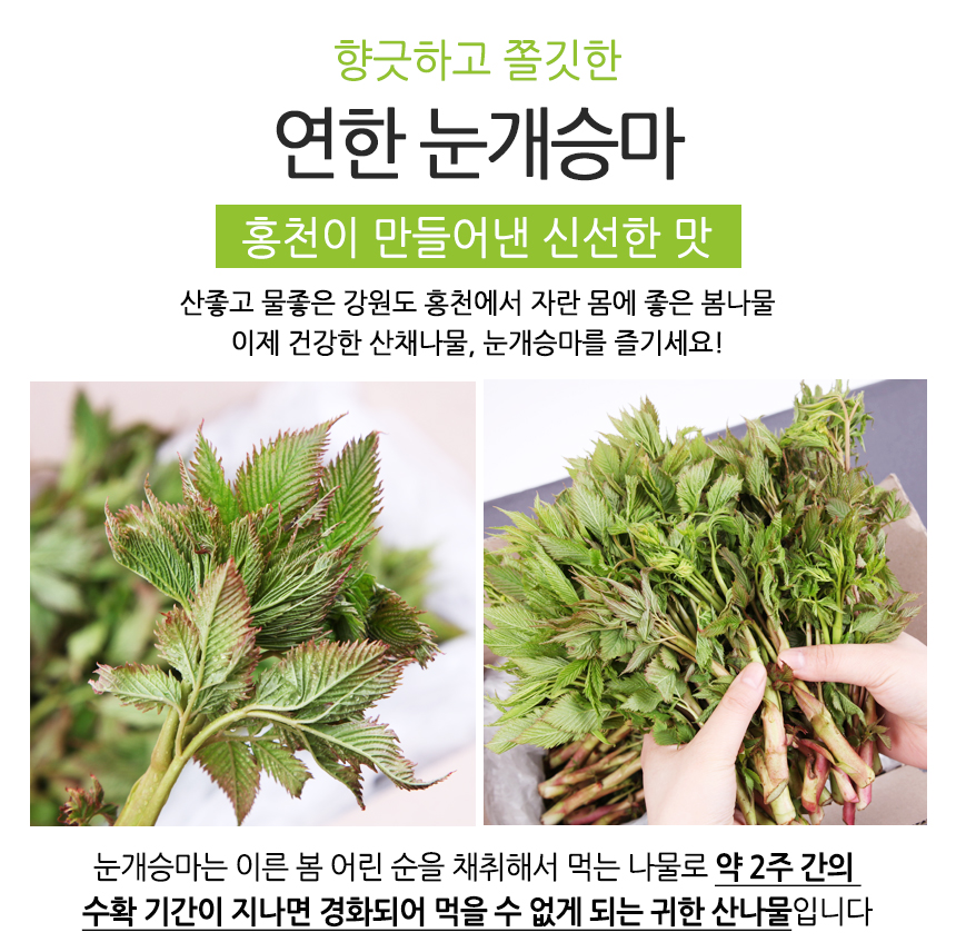 - 강원도 홍천 청정지역에서 자란 맛있는 눈개승마 / 해발 600m 고랭지에서 자라 연하고 부드러워요!